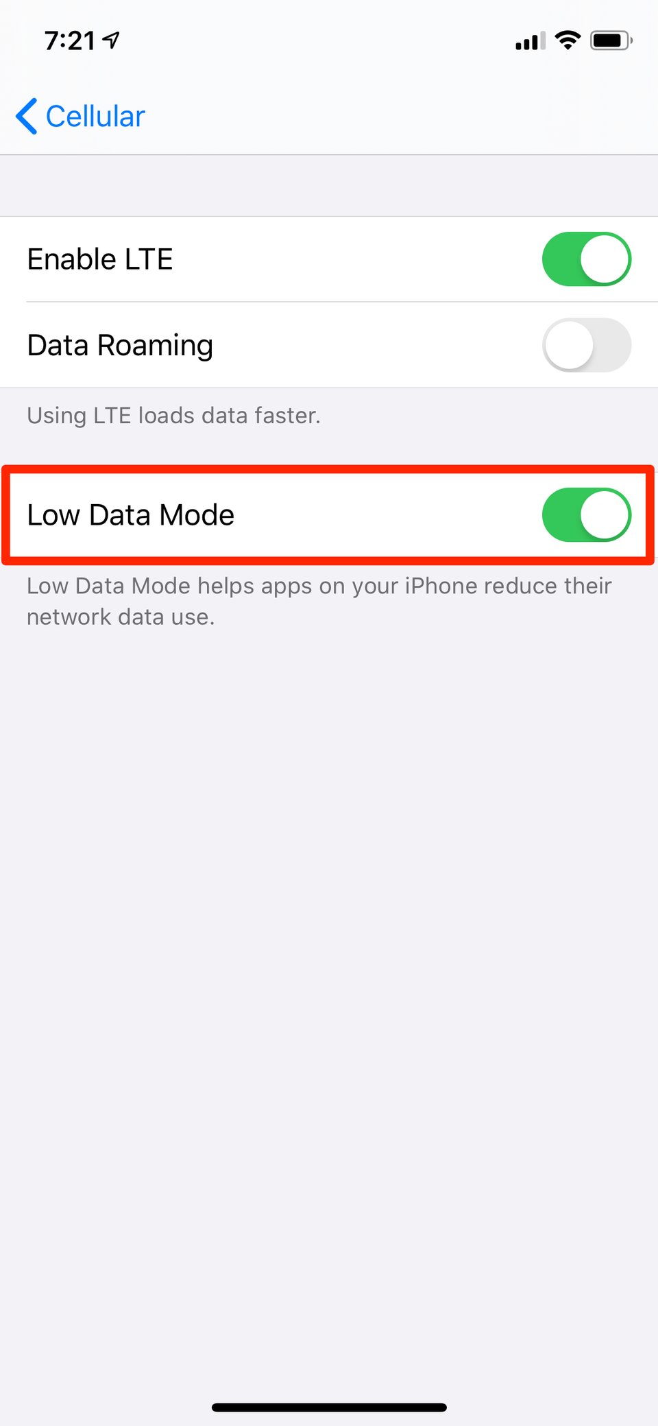 Cách kích hoạt chế độ Low Data Mode cho dữ liệu di động.