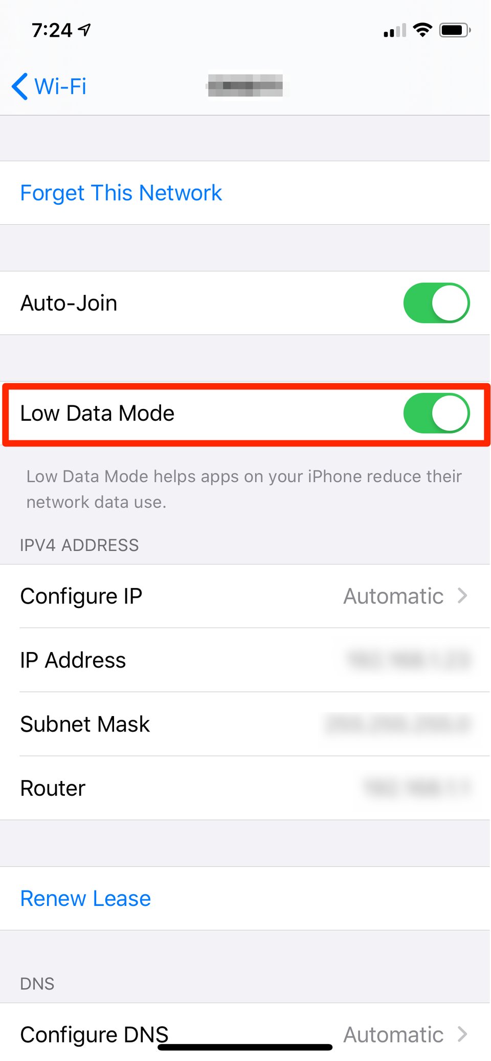 5. Ở màn hình thiết lập của mạng Wi-Fi, hãy kích hoạt chế độ “Low Data Mode” bằng cách gạt nút chọn sang bên phải.