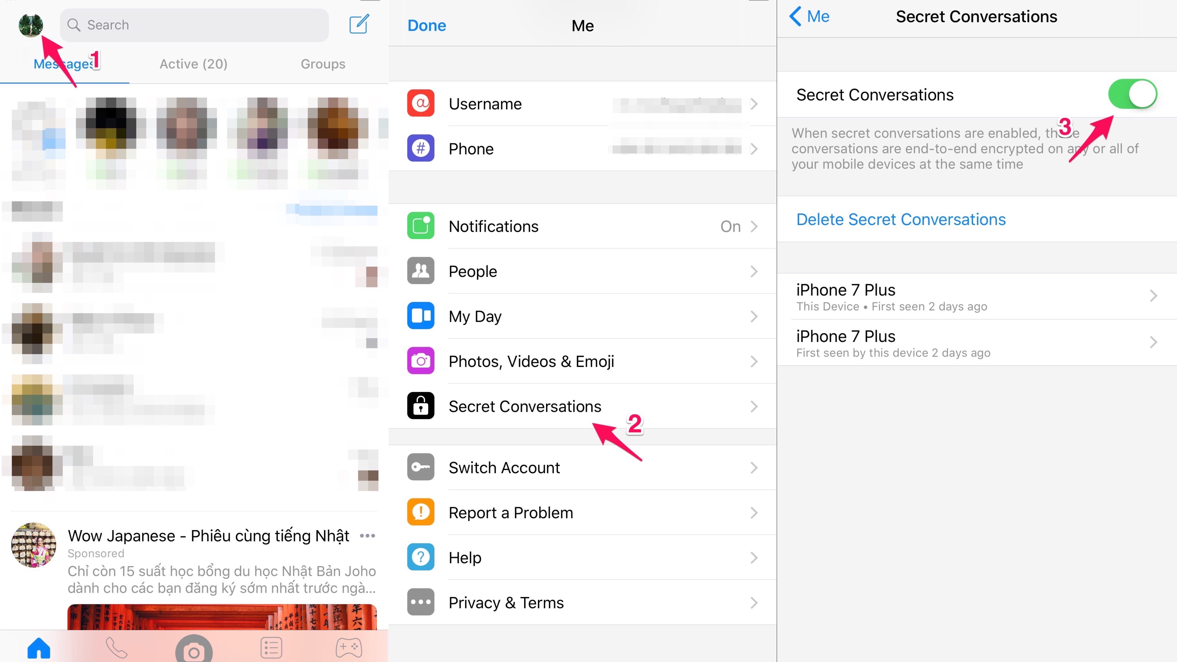 Để sử dụng tính năng này, người dùng chọn vào biểu tượng góc trái trên cùng của ứng dụng, chọn Secret Conversations và bật Turn On chế độ. Tiếp đến, người dùng trở về màn hình chính của ứng dụng, chọn biểu tượng soạn tin, ấn Secret và chọn người bạn muốn trò chuyện cùng.