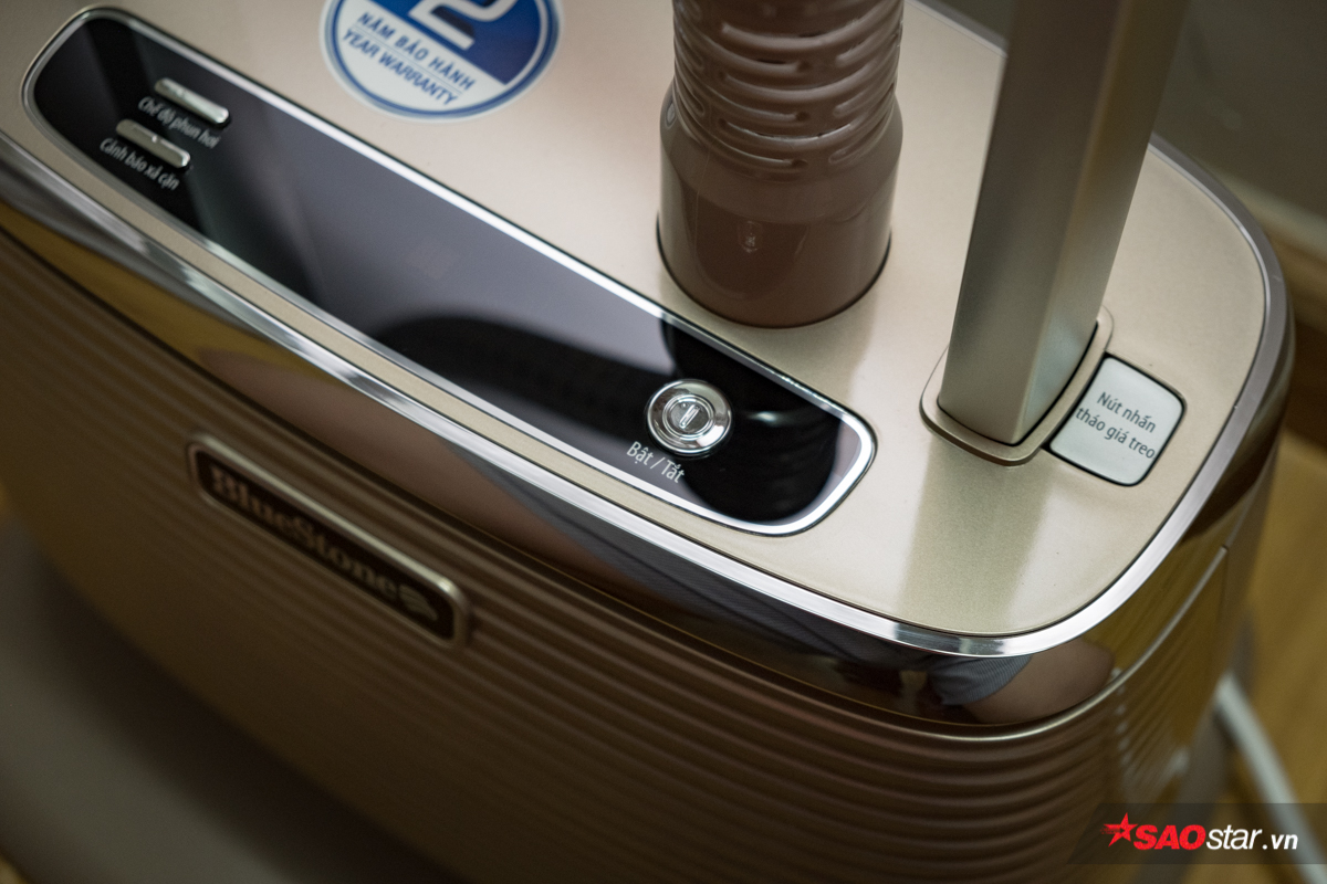 Phần đế của chiếc bàn ủi đứng này chỉ có một số nút bấm cơ bản để tạo trải nghiệm tinh gọn, ví dụ như nút chọn chế độ ủi, đèn cảnh báo xả cặn, nút tháo giá treo hay nút nguồn.