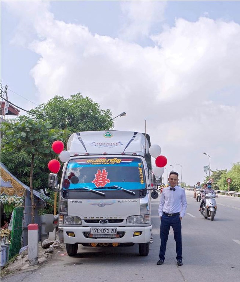 Chú rể Trần Tiến Hỷ bên cạnh một chiếc xe tải được trang trí đậm chất đám cưới, sẵn sàng cho lễ đón dâu.