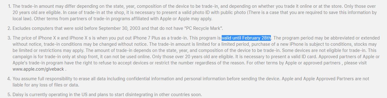 Tại một số thị trường, chương trình này dự kiến sẽ kết thúc vào ngày 31 tháng 1 tới. Tuy nhiên, một số người dùng mới đây đã phát hiện chương trình “ưu đãi” của Apple hiện đã được gia hạn thêm khoảng một tháng, đồng nghĩa là sẽ kéo dài đến cuối tháng 2/2019. Hiện tại, chương trình khuyến mãi này đang được áp dụng ở Úc, Canada, Trung Quốc, Hồng Kông, Nhật Bản, Ma Cao, Đài Loan. Tại khu vực Bắc Mỹ, Châu Á và một số quốc gia châu Âu, gồm có: Áo, Bỉ, Đức, Tây Ban Nha, Pháp, Ý, Hà Lan, Thụy Sĩ, Thụy Điển, Anh. Do đó, Phone Arena dự đoán, các quốc gia khác ngoài Nhật Bản sẽ sớm được gia hạn thời gian ưu đãi, trước ngày 31 tháng 1. Theo một nguồn tin từ Bloomberg trước đó, khoảng 1 tháng sau khi phát hành iPhone Xs/Xs Max, Apple đã chuyển một số nhân viên tiếp thị từ các dự án khác sang nhằm tăng doanh số iPhone mới nhất. Một người gọi động thái này là “cứu hỏa” của Apple, ngầm thừa nhận thiết bị có thể bán ít hơn dự đoán. Nhiều chuyên gia nhận định, việc khuyến mãi có thể đến từ việc doanh số iPhone bị sụt giảm vào thời gian vừa qua. Các chương trình khuyến mãi sẽ giúp kích cầu tiêu dùng và tăng doanh số bán hàng của Apple trong năm nay.