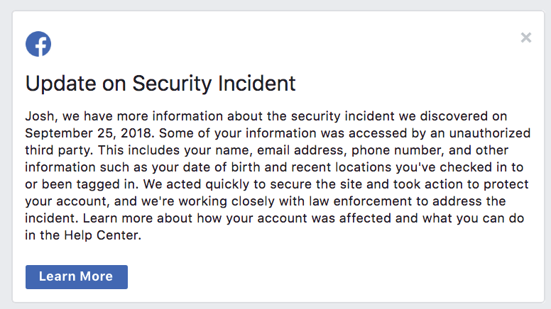 Bước 3: Nếu nằm trong số những nạn nhân bị ảnh hưởng trong vụ hack, Facebook sẽ gửi cảnh báo như sau.