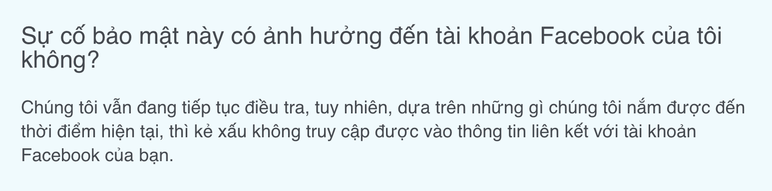 Trong trường hợp không có gì ảnh hưởng, Facebook sẽ hiển thị nội dung: “Chúng tôi vẫn đang tiếp tục điều tra, tuy nhiên, dựa trên những gì chúng tôi nắm được đến thời điểm hiện tại, thì kẻ xấu không truy cập được vào thông tin liên kết với tài khoản Facebook của bạn”.