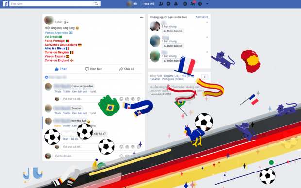 Những hiệu ứng đặc biệt này gắn liền với một số Đội tuyển được yêu thích tại kỳ World Cup 2018 lần này như Đức, Brazil, Pháp, … Chúng có thể được kích hoạt ngay trên cả máy tính và smartphone (ứng dụng Facebook phiên bản mới nhất). Khi bạn bình luận của bạn có càng nhiều từ khóa, hiệu ứng đặc biệt này sẽ càng dồn dập.