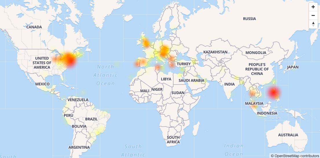 Bản đồ các khu vực được cho là có người dùng bị ảnh hưởng nhiều nhất vì lỗi lần này của Facebook.