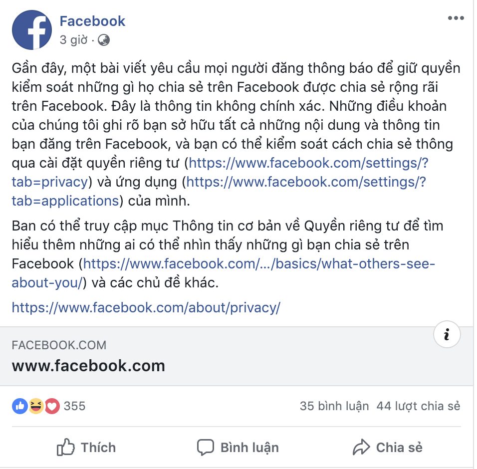 “Gần đây, một bài viết yêu cầu mọi người đăng thông báo để giữ quyền kiểm soát những gì họ chia sẻ trên Facebook được chia sẻ rộng rãi trên Facebook. Đây là thông tin không chính xác. Những điều khoản của chúng tôi ghi rõ bạn sở hữu tất cả những nội dung và thông tin bạn đăng trên Facebook, và bạn có thể kiểm soát cách chia sẻ thông qua cài đặt quyền riêng tư và ứng dụng của mình”.