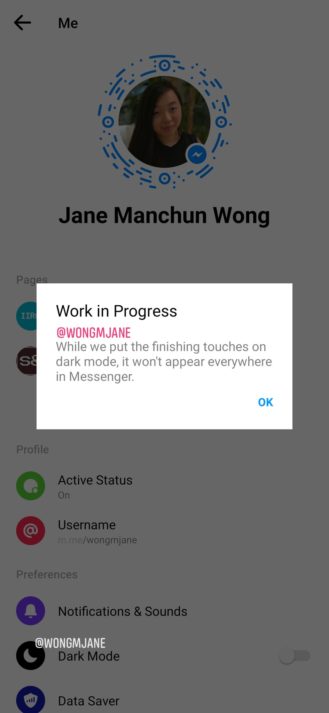 Theo nguồn tin rò rỉ, tuỳ chọn ban đêm có thể được kích hoạt trong phần Me của ứng dụng Facebook Messenge. Khi kích hoạt, người dùng sẽ nhận được một thông báo rằng chế độ Dark Mode vẫn đang trong giai đoạn phát triển. Thông báo này cho biết thêm rằng có thể chế độ Dark Mode vẫn chưa xuất hiện tại mọi chi tiết trong phiên bản thử nghiệm này.