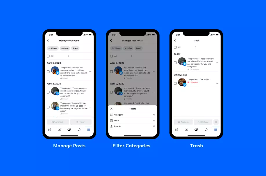Manage Activity mang đến cho người dùng hai lựa chọn. Bài đăng bị xoá có thể được chuyển tới thùng rác. Điều này có nghĩa là những người dùng khác sẽ không còn có thể xem được nó nhưng chỉ được xoá vĩnh viễn sau 30 ngày. Hoặc các bài đăng có thể được chuyển sang dạng lưu trữ, tức là người dùng khác sẽ không xem nhưng chủ nhân bài đăng thì vẫn có thể xem được chúng.