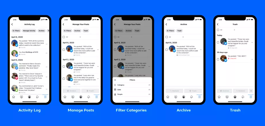 Facebook mới đây đã bổ sung thêm một tính năng mới mang tên gọi Manage Activity cho phép người dùng xoá những bài đăng cũ của mình. Nó có thể được sử dụng để xoá từng bài đăng hoặc xoá các bài đăng theo lô. Facebook cho biết sẽ cho phép người dùng sử dụng nhiều bộ lọc để tìm ra các bài đăng cần xoá nhanh hơn, ví dụ như bài đăng với một người cụ thể nào đó hoặc ở trong một khoảng thời gian cụ thể nào đó. Manage Activity sẽ có mặt trên ứng dụng di động của mạng xã hội này trước.