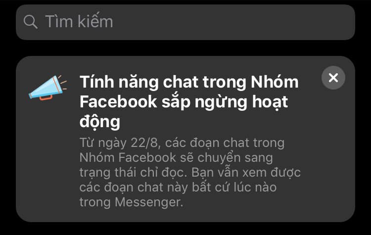 Bắt đầu từ hôm qua, nhiều người dùng Facebook tại Việt Nam đã bất ngờ nhận được một thông báo mới trong ứng dụng Messenger của mình: “Tính năng chat trong Nhóm Facebook sắp ngừng hoạt động.” Thông báo này khiến rất nhiều người dùng Facebook “mất ăn mất ngủ” vì lo rằng tính năng chat nhóm sẽ bị “khai tử”, nhưng thông tin này liệu có chính xác?