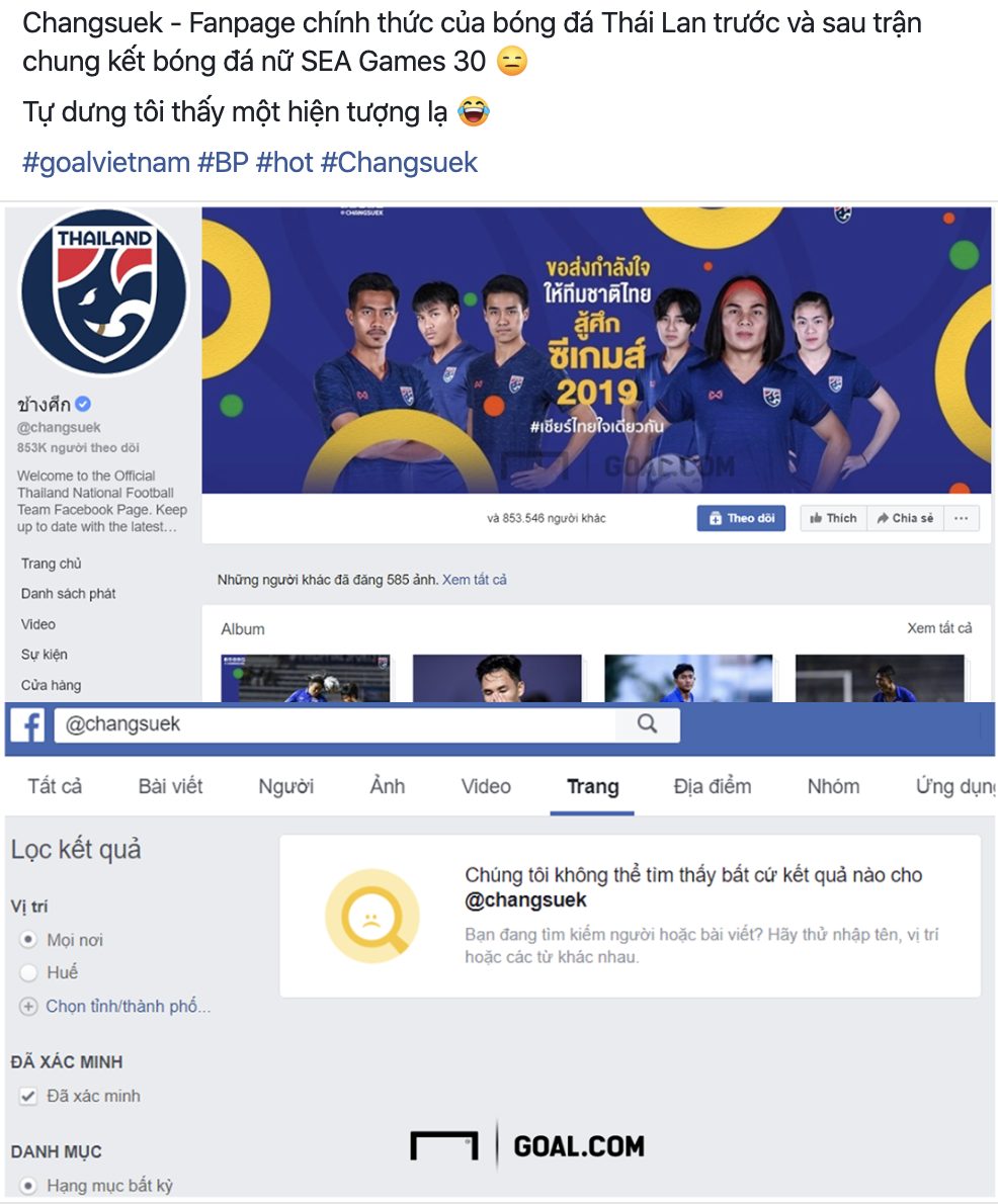 Cụ thể, các tài khoản Facebook ở Việt Nam hiện tại đều không thể tìm kiếm và truy cập fanpage chính thức của bóng đá Thái Lan - Changsuek. Khi người dùng Facebook Việt Nam gõ từ khoá “Changsuek” ở thanh tìm kiếm, kết quả trả về sẽ là một thông báo có nội dung “Chúng tôi không thể tìm thấy bất cứ kết quả nào cho Changsuek”.
