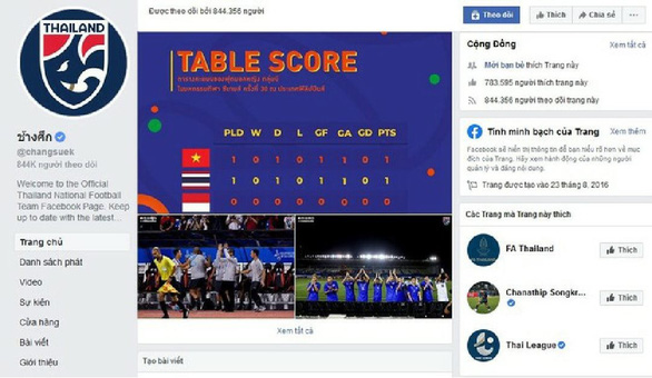 Theo một số nguồn tin, trang fanpage chính thức của bóng đá Thái Lan ở địa chỉ @changsuek mới đây đã chính thức chặn các địa chỉ IP tại Việt Nam. Điều này đồng nghĩa với việc người dùng Facebook tại Việt Nam sẽ không thể tìm kiếm được nó.