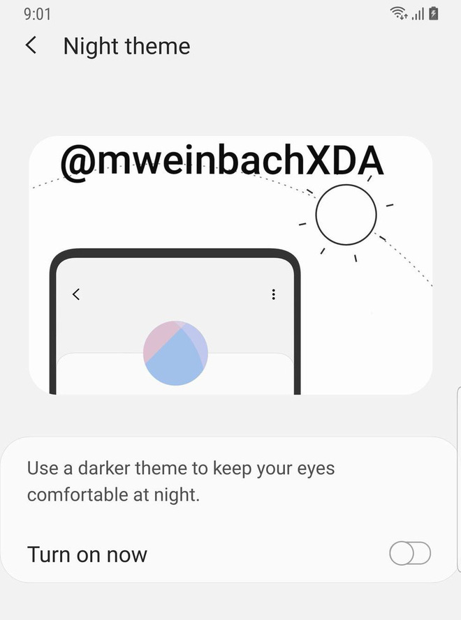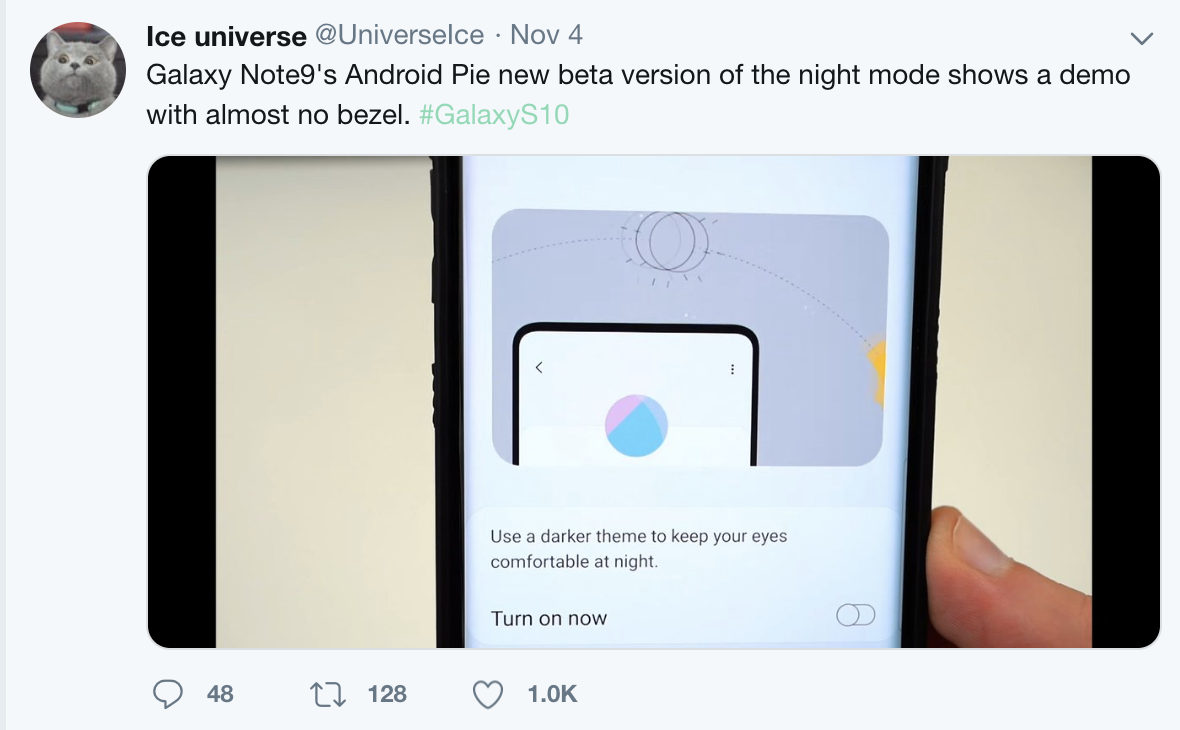 Theo Gizchina, trong bản cập nhật Android 9.0 Pie beta dành cho Galaxy Note 9, ở tính năng Night Theme xuất hiện hình ảnh một chiếc smartphone không có camera, loa thoại trước cùng viền màn hình siêu mỏng. Điều đó khiến nhiều người tin rằng đó là hình ảnh thiết kế của Galaxy S10.