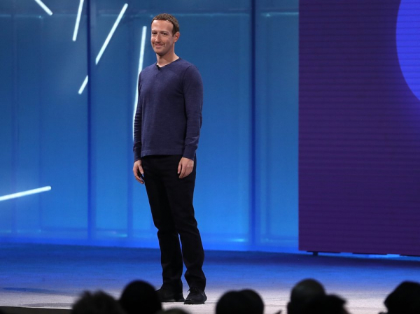 Đây là Mark Zuckerberg trên sân khấu sự kiện thường niên F8 năm 2018. Anh mặc một chiếc áo hoodies cùng quần jeans xanh.