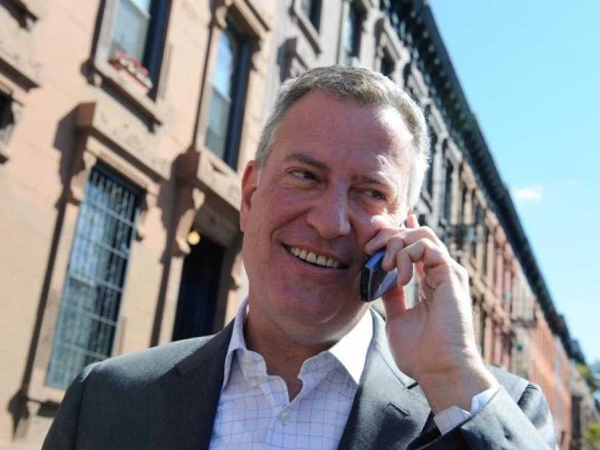 Thị trưởng New York Bill De Blasio xuất hiện trước công chúng với điện thoại nắp gập