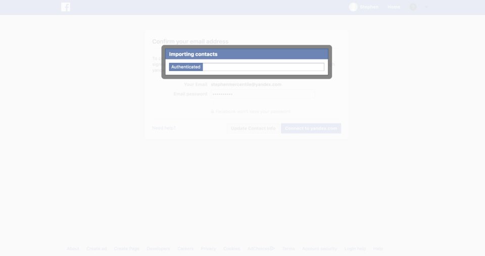 Business Insider cho biết thêm rằng nếu người dùng mới đồng ý nhập mật khẩu email của mình vào Facebook, một hộp thoại cũng sẽ hiển thị cho biết Facebook đang “nhập vào danh bạ của bạn” - dù chưa xin phép người dùng để làm điều đó. Business Insider liên hệ với Facebook để tìm câu trả lời và nhận được phản hồi cho biết Facebook đang huỷ bỏ tính năng trên nhưng không đi sâu chi tiết vào thời gian.