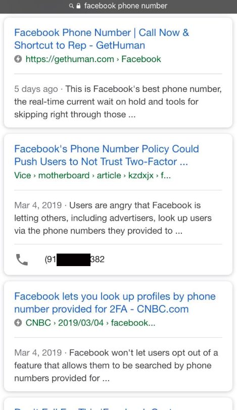 Số điện thoại của một cây viết trên VICE xuất hiện nổi bật khi người dùng tìm kiếm “số điện thoại của Facebook.”