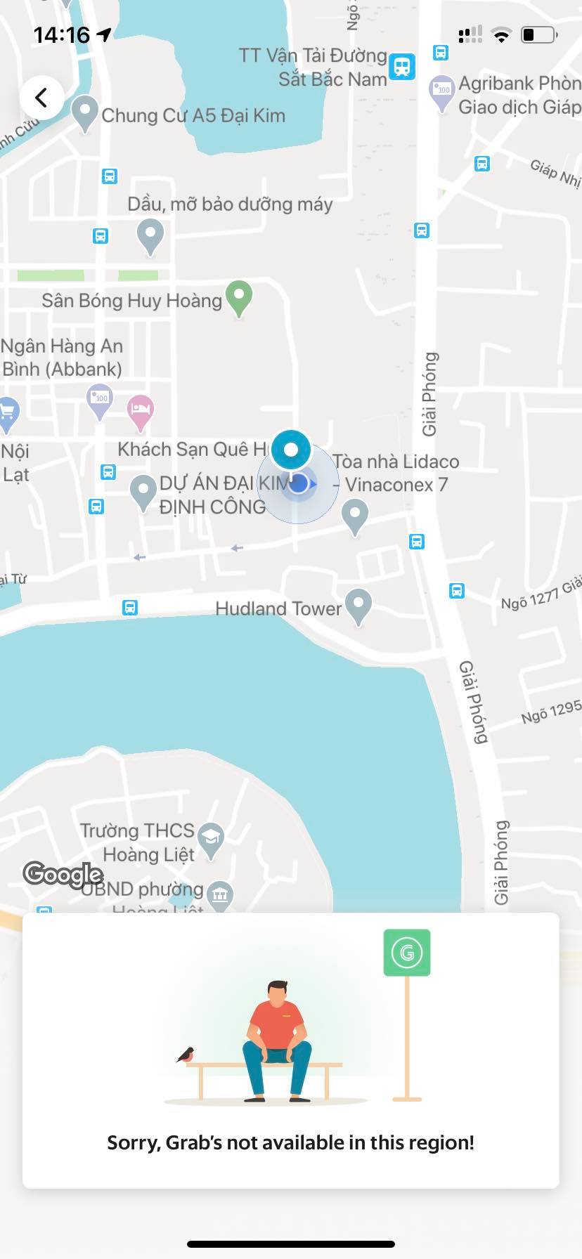 Thông báo “Grab vẫn chưa khả dụng tại khu vực này” xuất hiện khi người dùng muốn gọi xe tại Hà Nội.