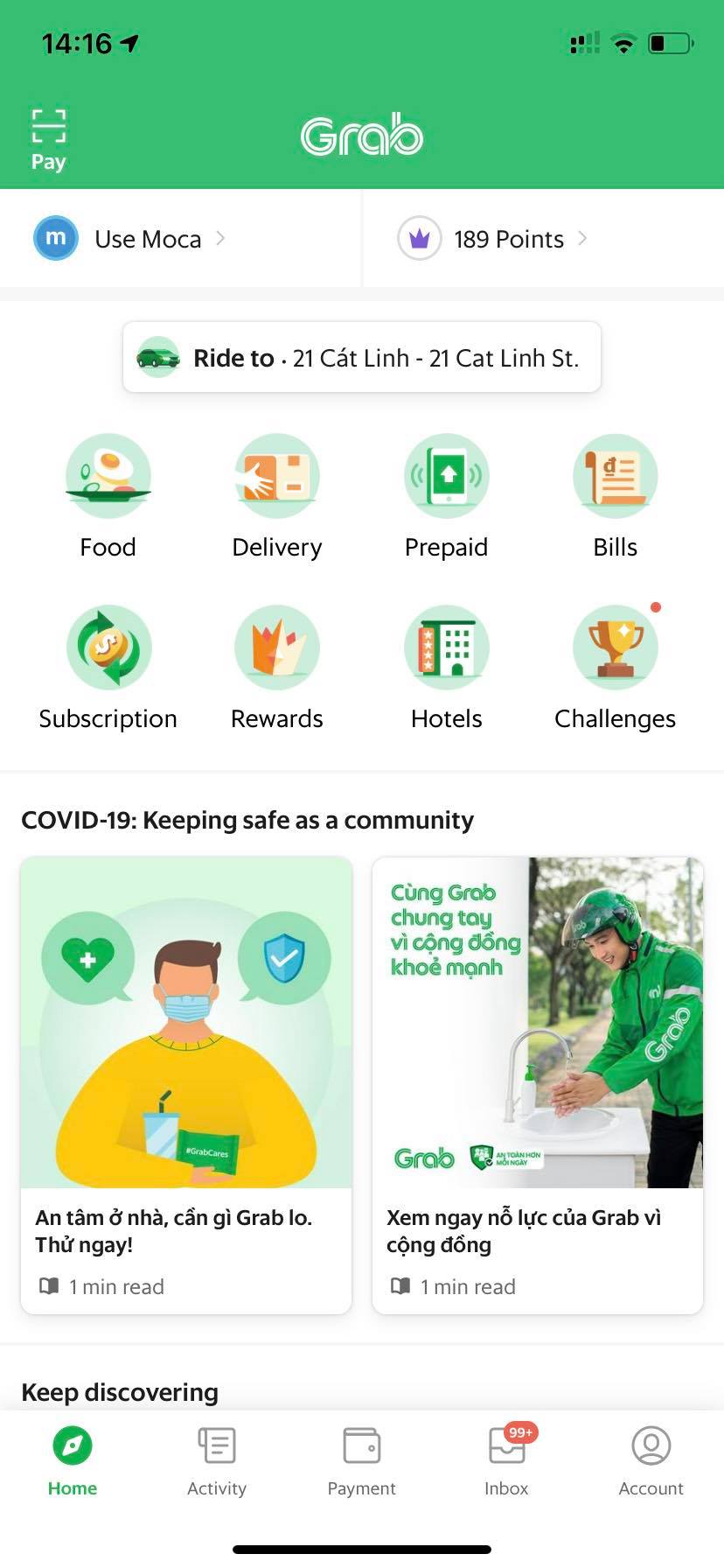 Tab “Dịch vụ” trên ứng dụng Grab đã không còn khả dụng đối với người muốn đặt xe tại Hà Nội.