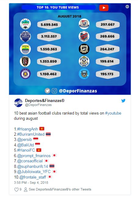 Tuy nhiên, kênh YouTube của HAGL lại tỏ ra vượt trội hơn hẳn khi bỏ xa Buriram United (đội bóng xếp thứ 2) tới hơn 2 triệu lượt xem. Trước đó, kênh YouTube của đội bóng Phố núi cũng từng dẫn đầu ở BXH này vào tháng 6 và tháng 7, thời điểm World Cup 2018 diễn ra.