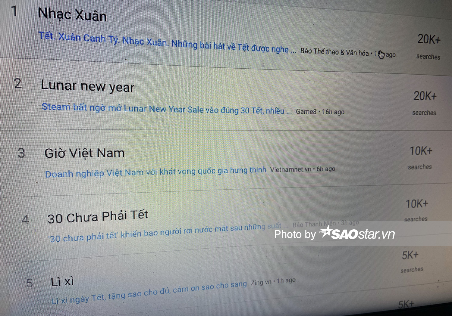 Sáng mùng 1 Tết Nguyên đán 2020 (25/01), từ khoá “Nhạc Xuân” đang nằm trong top các từ khoá được tìm kiếm nhiều nhất trong năm 2020. Những từ khoá được tìm kiếm nhiều nhất còn lại cũng liên quan đến kì nghỉ Tết Nguyên đán, như “Lunar New Year”, “Giờ Việt Nam”, “30 Chưa Phải Tết” hay “Lì xì”.