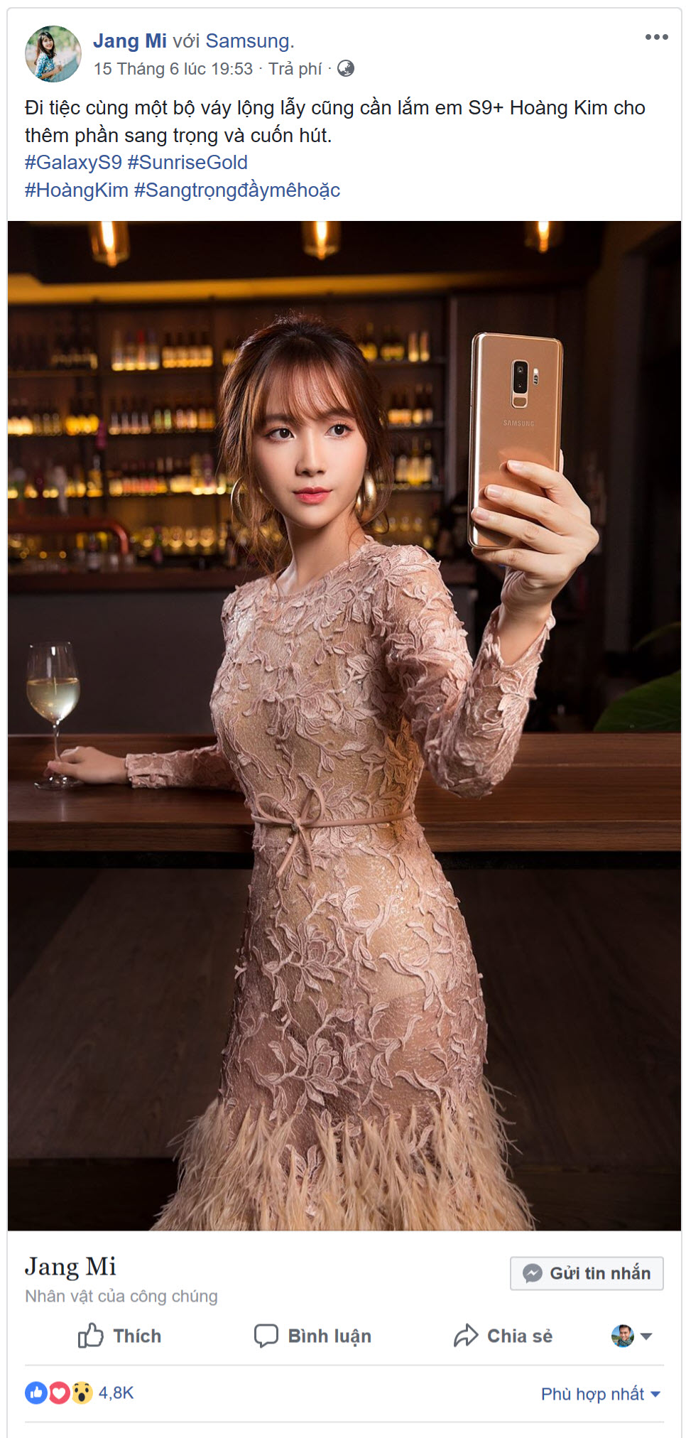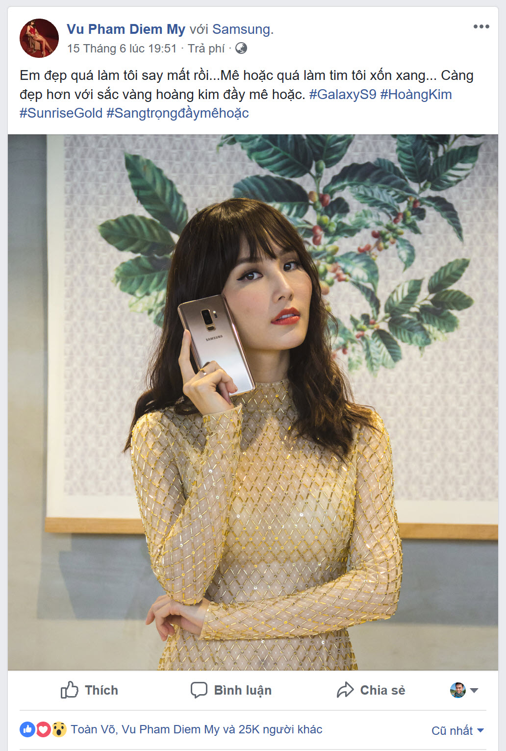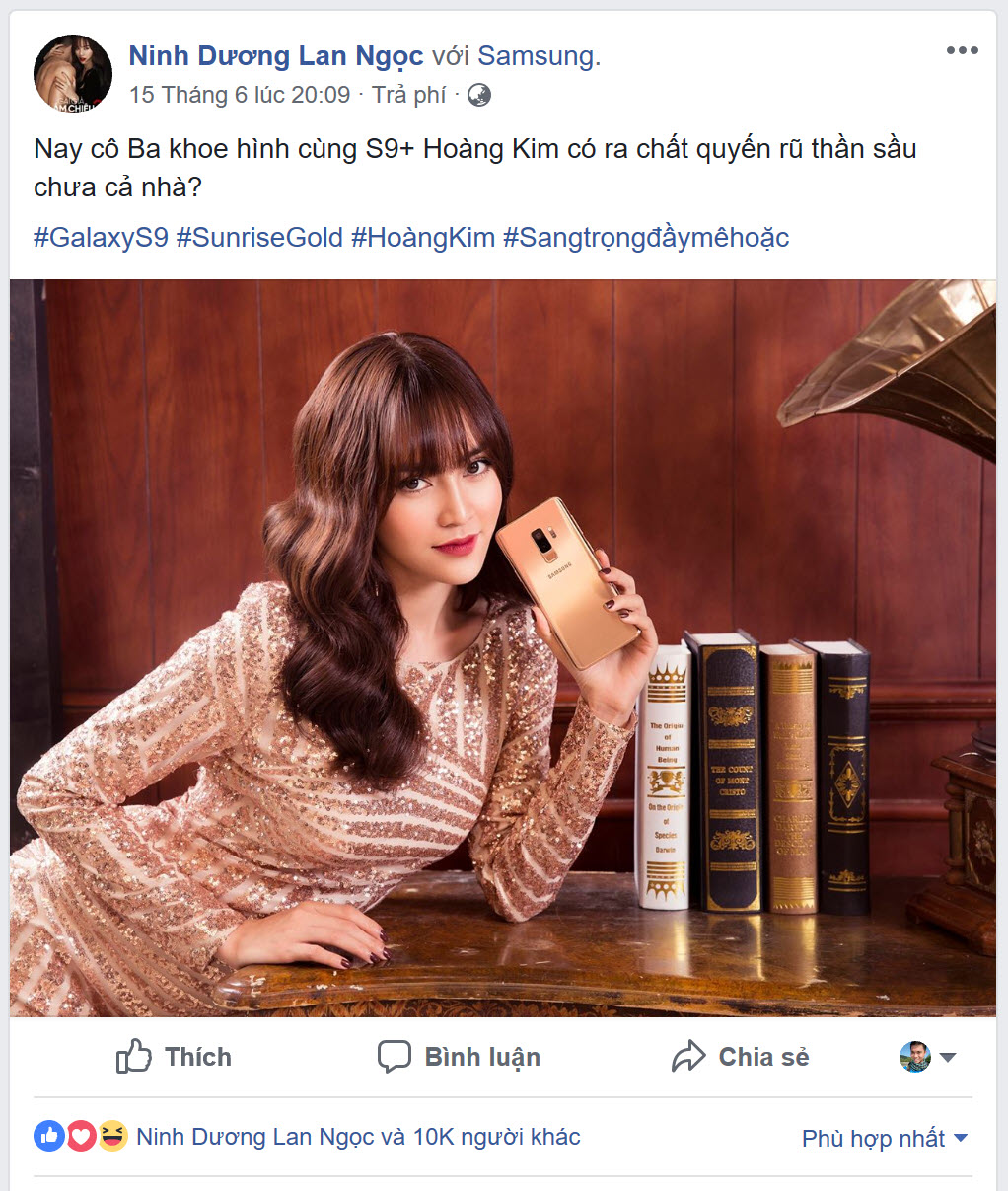 Sở hữu công nghệ đỉnh cao của smartphone cùng thiết kế duy mỹ từ góc cạnh đến màu sắc thời thượng, Galaxy S9+ Hoàng Kim là “phụ kiện” đẳng cấp không thể thiếu cho nhiều sao Việt. Hàng loạt tên tuổi đình đám khác của làng giải trí đã nhanh chóng hưởng ứng nhiệt tình là minh chứng cho sức hút khó cưỡng từ smartphone cao cấp của Samsung và trào lưu thời trang hoàng kim đầy cảm hứng này.