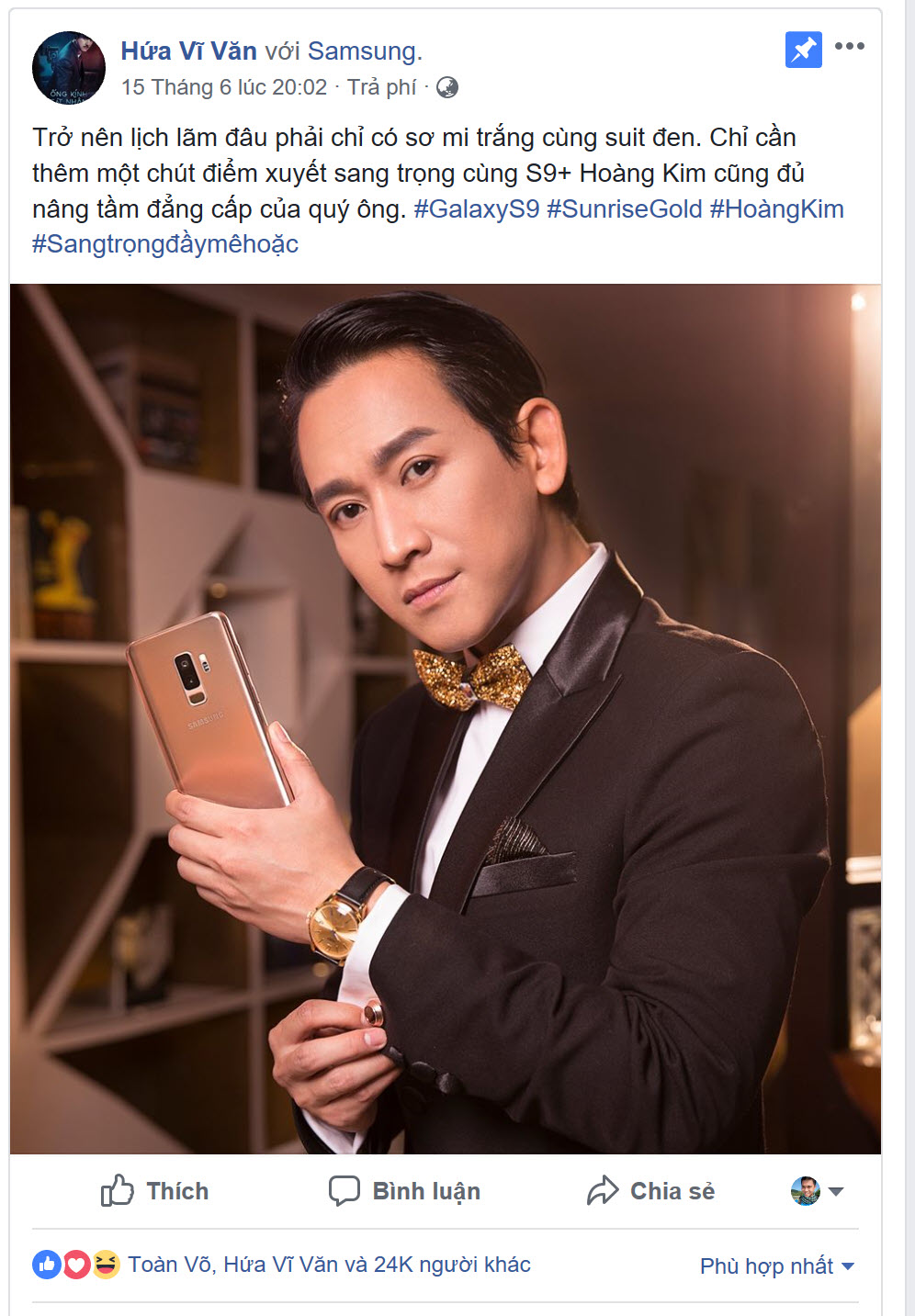 Đẳng cấp quý ông lịch lãm, thành công của nam thần Hứa Vĩ Văn với sự kết hợp của set đồ vest đen mạnh mẽ và các món phụ kiện vàng phiên bản Hoàng Kim ấn tượng, tất nhiên không thể thiếu điểm nhấn là chiếc Galaxy S9+ Sunrise Gold mới.