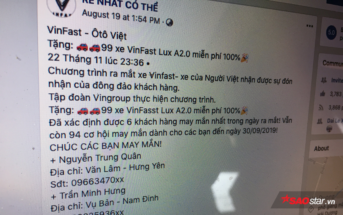 “VinFast - Ô tô Việt, tặng 99 xe VinFast Lux A2.0 miễn phí 100%,” một bài đăng trên Facebook nhận được hàng trăm bình luận và chia sẻ, viết. Để tăng thêm tính thuyết phục, bài đăng này thậm chí đăng tải danh sách 6 người đã trúng thưởng chiếc xe của VinFast và khẳng định vẫn còn 94 cơ hội. Tất cả những gì người dùng cần làm để có thể trúng xe là like fanpage chia sẻ thông tin, bình luận màu xe yêu thích và 6 số cuối trong số điện thoại và cuối cùng là chia sẻ bài viết ở chế độ công khai.