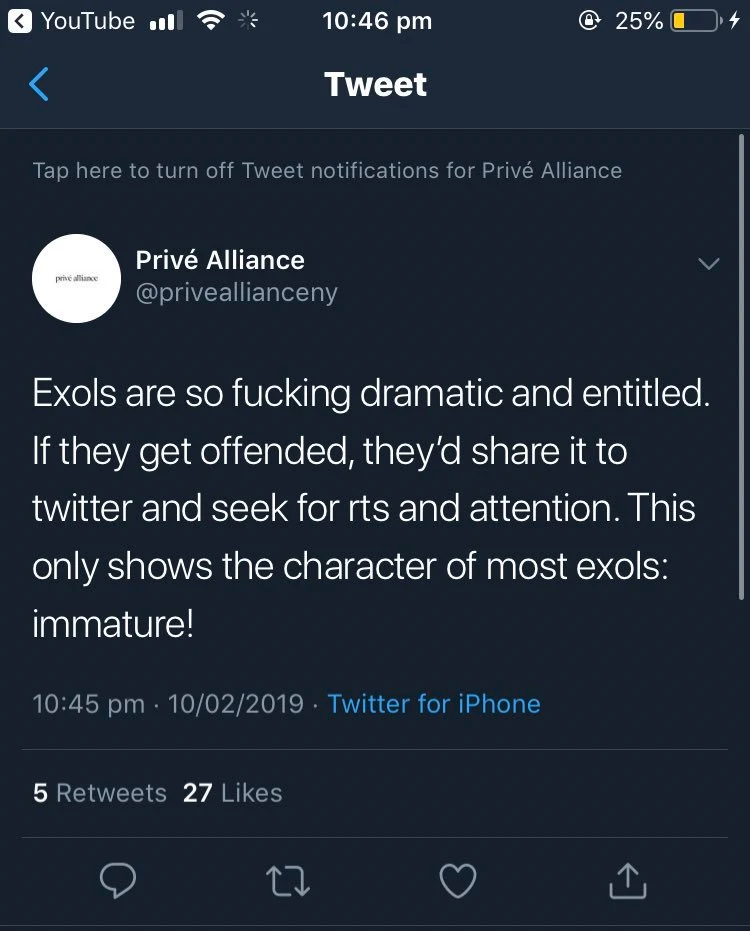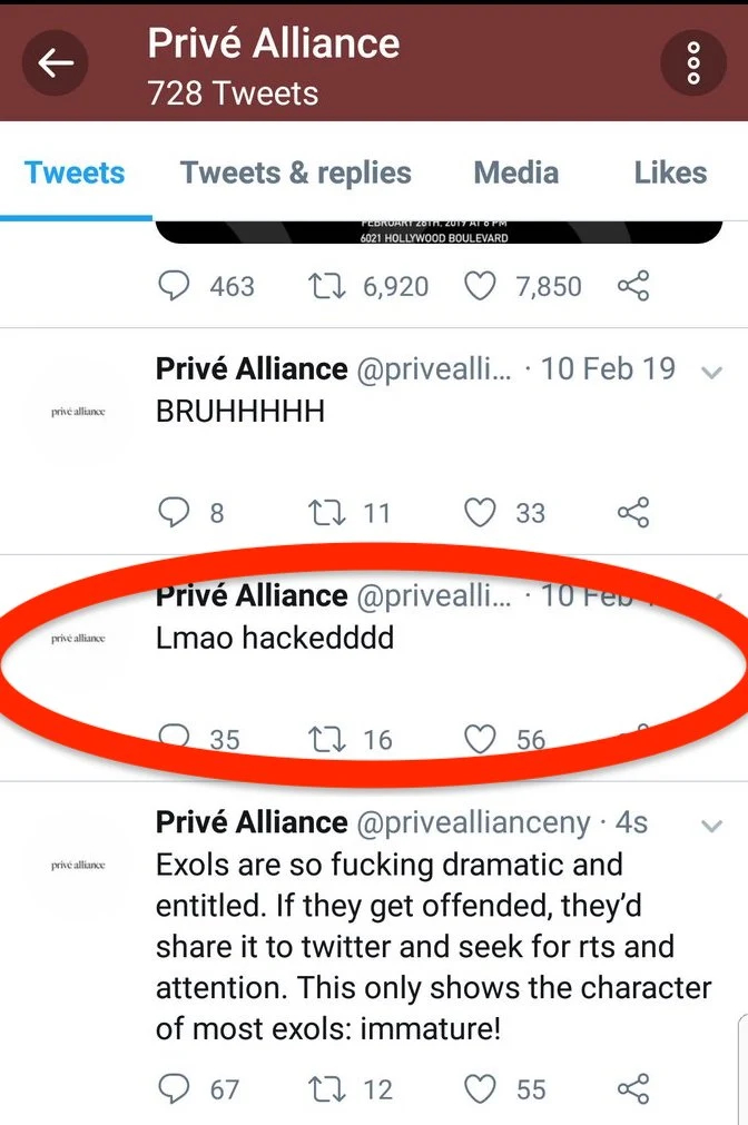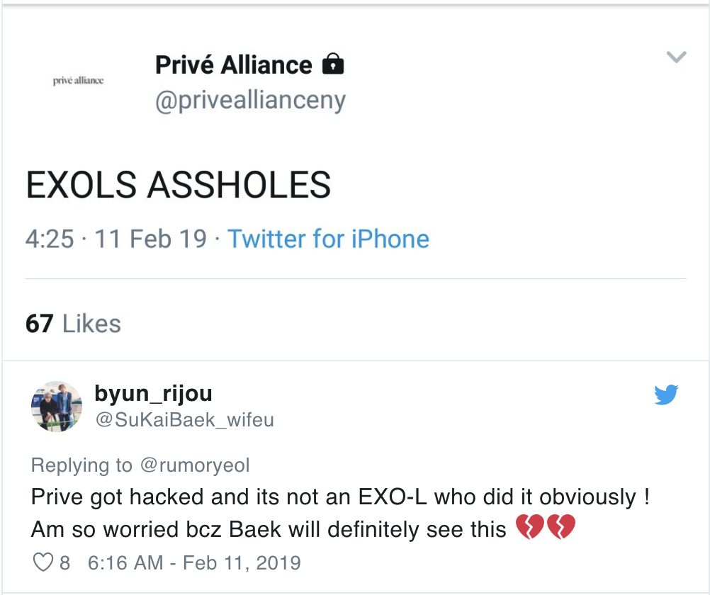 Mọi chuyện sẽ chẳng có gì để nói nếu như tài khoản Twitter chính thức của Privé Alliance không bỗng dưng đăng tải các tweet có nội dung lăng mạ cộng đồng EXO-L.