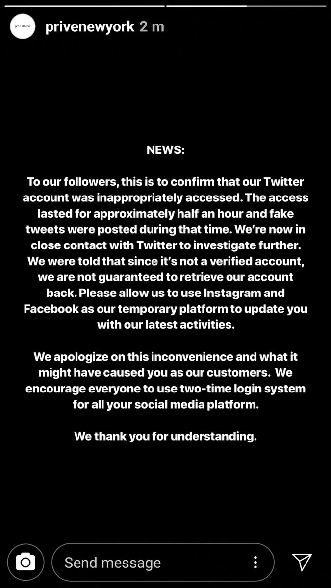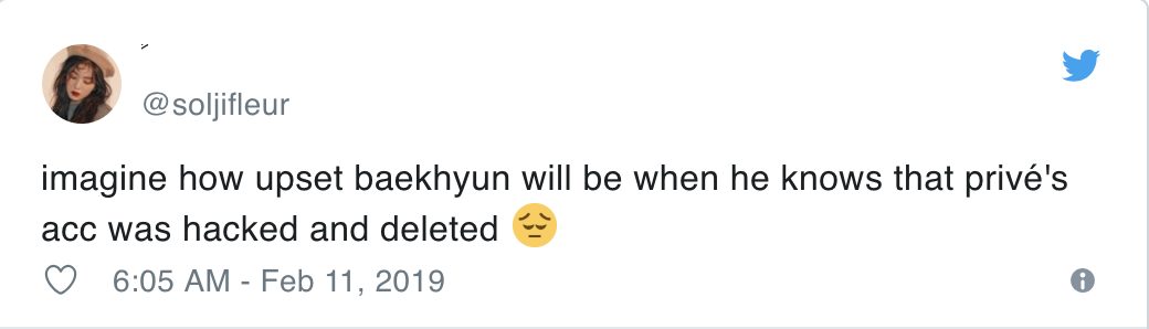 Ngay sau khi đoạn tweet này được đăng tải, tài khoản Privé Alliance trên Instagram đã nhanh chóng cảnh báo rằng tài khoản của hãng đã bị hacker chiếm quyền điều khiển. Đồng thời, Privé Alliance cũng gửi lời xin lỗi sâu sắc đến cộng đồng EXO-L và hứa sẽ nhanh chóng giải quyết vấn đề.