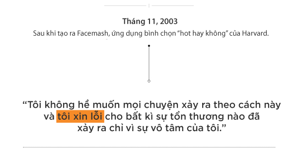 Trang WashingtonPost mới đây đã thực hiện tổng hợp lại tất cả các lần xin lỗi của Mark Zuckerberg trước công chúng, kể từ thời điểm năm 2003, lúc anh tạo ra Facemash, tiền thân của Facebook. Trong loạt hình minh họa dưới đây, phần chữ tô màu da cam thể hiện những lời xin lỗi trong khi đó phần chữ màu xanh thể hiện những lời hứa.