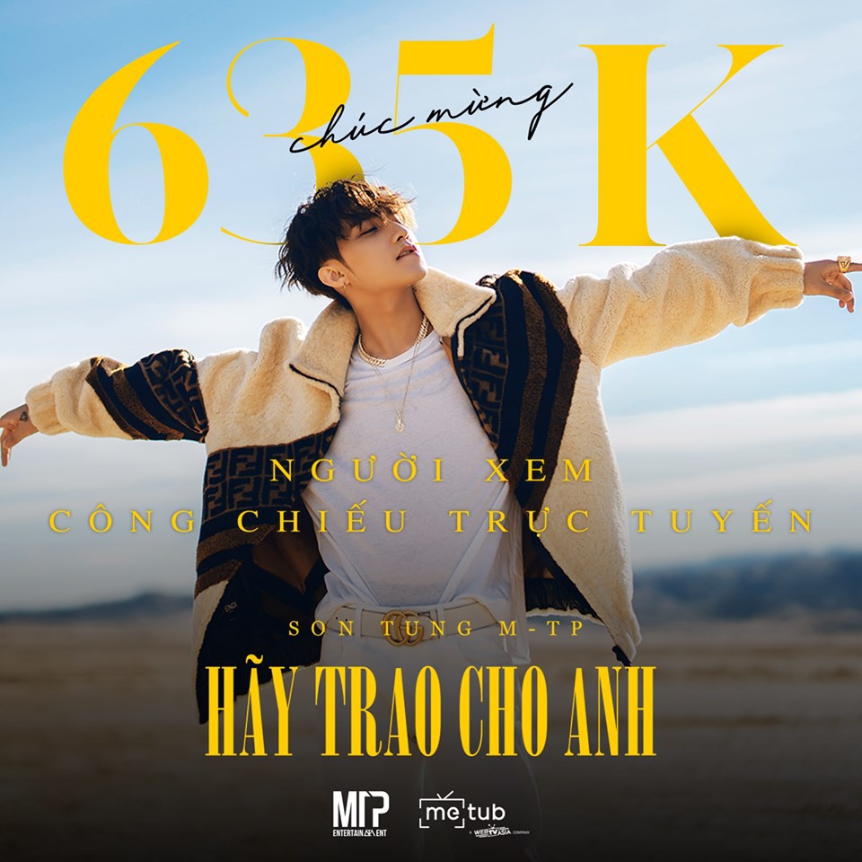 Theo thông tin vừa được METUB Network phát đi, MV “Hãy trao cho anh” của Sơn Tùng M-TP đã xuất sắc cán mốc 1 triệu lượt xem chỉ trong vòng vỏn vẹn 8 phút. Ấn tượng hơn, Sơn Tùng M-TP chỉ cần thêm 6 phút nữa để có thêm 1 triệu lượt xem tiếp theo. Trong khi đó, trong vòng 50 phút đầu tiên kể từ khi phát sóng chính thức, nam ca sỹ Thái Bình đã bro túi 4,7 triệu lượt xem cùng sản phẩm âm nhạc mới nhất của mình.