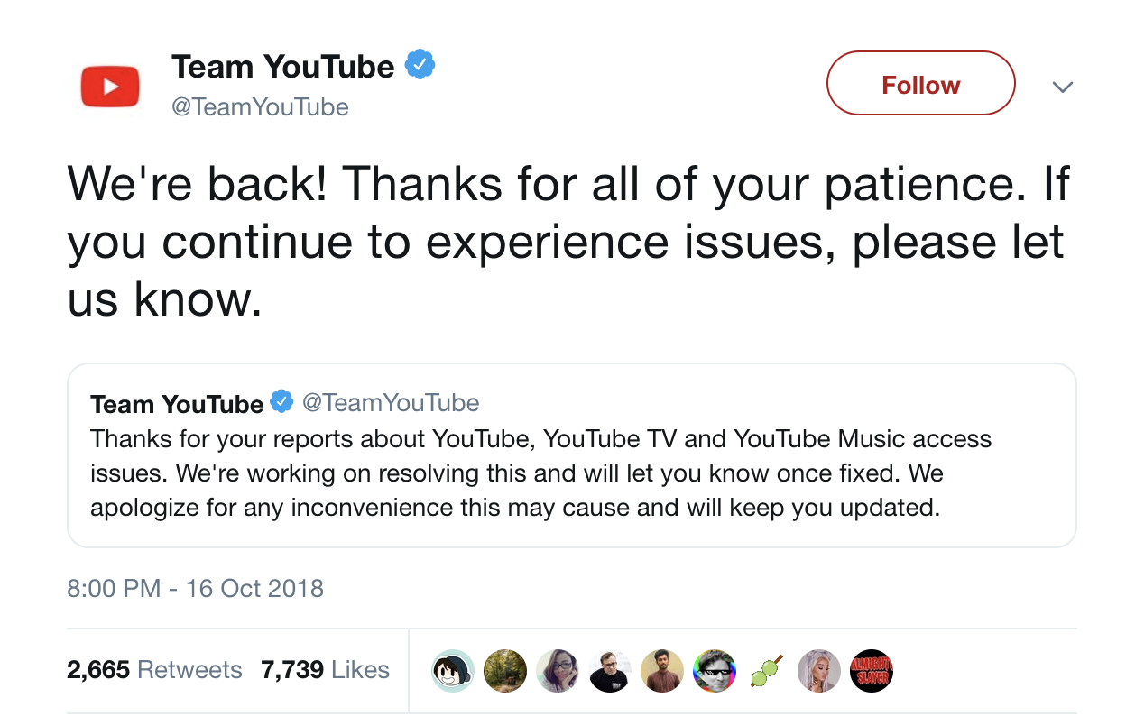 Theo CNBC, đây không phải là lần đầu tiên nền tảng video tỷ USD gặp vấn đề gián đoạn kết nối. Theo đó, trong trận đối đầu giữa Croatia và England tại FIFA World Cup 2018 diễn ra vào tháng 7, ứng dụng YouTube TV đã bị sập trong khoảng 40 phút thi đấu.