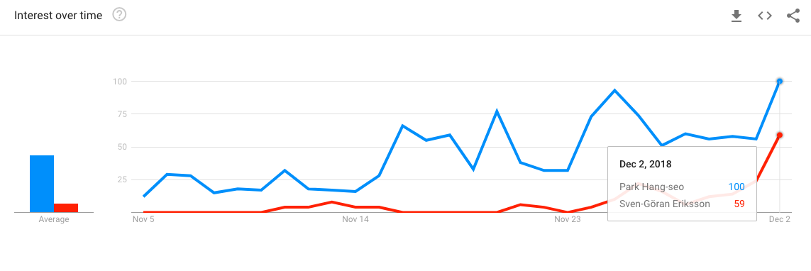 Tuy nhiên, có thể bạn sẽ bất ngờ khi biết ở thời điểm hiện tại, ông Park Hang Seo lại nhận được nhiều sự quan tâm hơn khá nhiều so với HLV Sven-Goran Eriksson. Theo ghi nhận của công cụ thống kê tìm kiếm Google Trends, từ khoá “Park Hang Seo” đang được tìm kiếm nhiều hơn so với từ khoá “Sven-Goran Eriksson” đáng kể trong khoảng thời gian 30 ngày trở lại đây. Số liệu này được thống kê trên phạm vi người dùng Google toàn thế giới. Cụ thể ở thời ngày 02/12 (ngày gần nhất công bố số liệu), nếu coi lưu lượng tìm kiếm “Park Hang Seo” là 100 thì lưu lượng tìm kiếm từ khoá “Sven-Goran Eriksson” chỉ dừng lại ở 59.