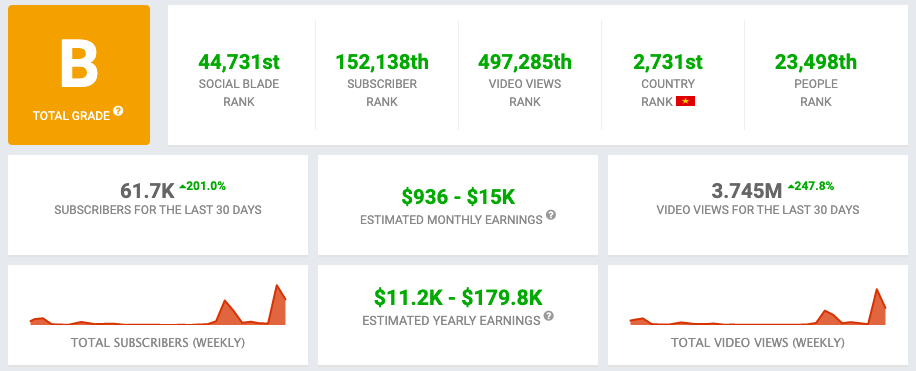 Cụ thể, SocialBlade tính toán kênh của H’Hen Niê có thể thu về số tiền trong mỗi tháng dao động ở thời điểm hiện tại lên tới từ 936 USD cho tới 15.000 USD. Dù vậy, thực tế thì số tiền một kênh YouTube thu về có thể phụ thuộc vào rất nhiều yếu tố như số lượng người xem video, thời lượng xem video thực tế hay quan trọng nhất là số lượng quảng cáo hiển thị hay số lượng người click vào quảng cáo.