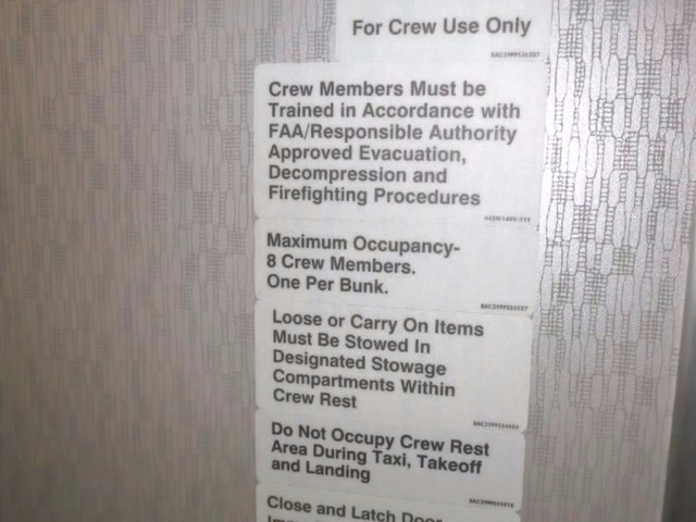 Biển ghi chú phía sau cánh cửa với nội dung 8 chiếc giường chỉ dành cho phi hành đoàn.