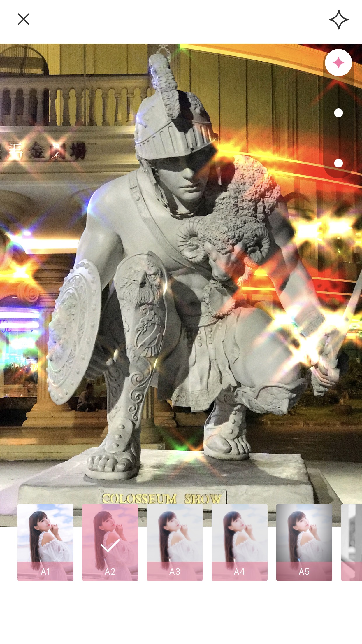 Bước 5: Lúc này bức ảnh của bạn sẽ trở nên lung linh hơn bao giờ hết. Tuy nhiên bạn vẫn có thể lựa chọn mật độ nhiều ít của các vùng lấp lánh bằng cách tuỳ chỉnh kéo thanh tuỳ chỉnh lên xuống ở phần đầu ứng dụng.