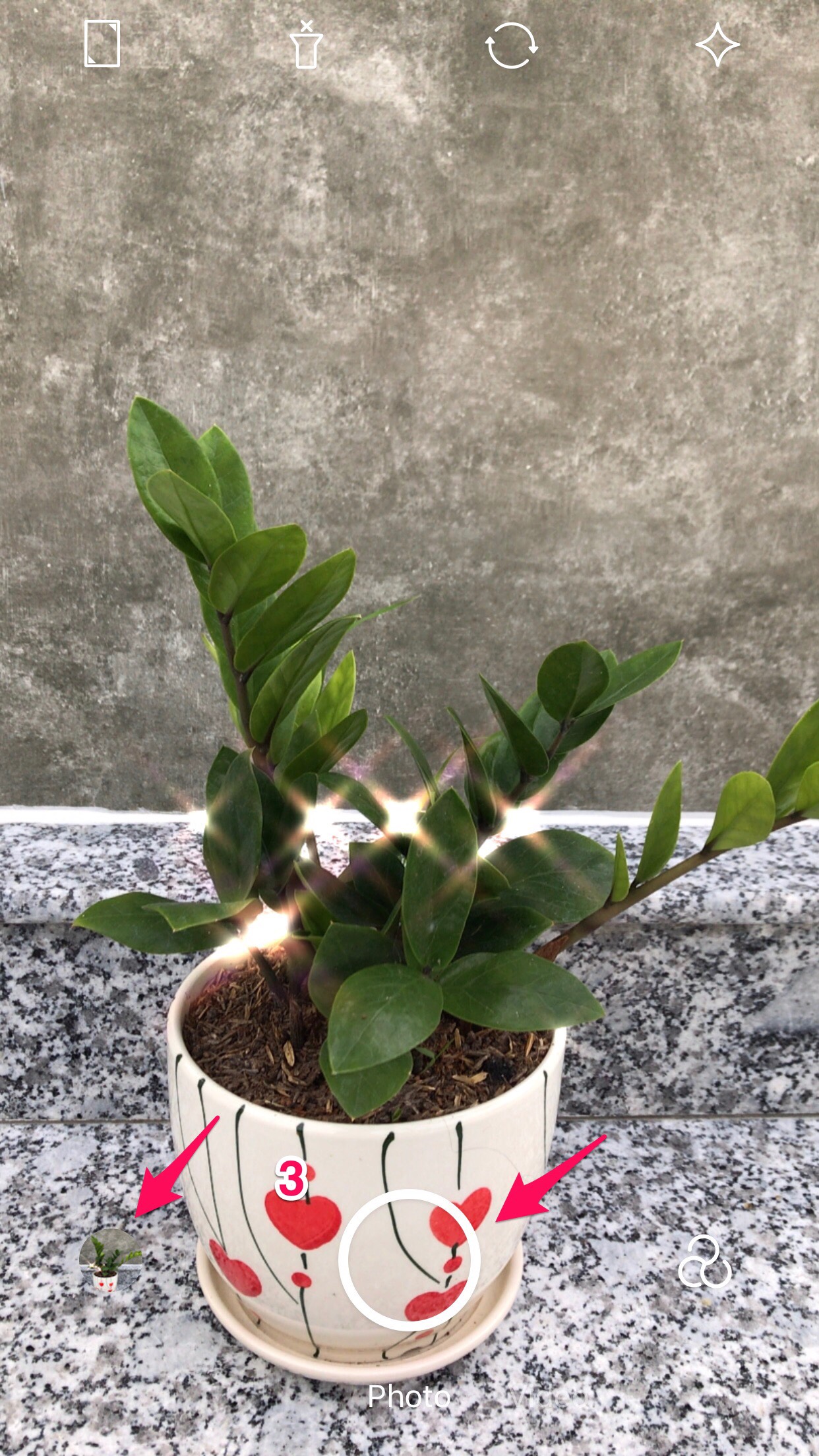Bước 3: Sau khi cấp phép quyền cho ứng dụng xong, bạn sẽ có 3 lựa chọn bao gồm chụp ảnh, quay video hoặc chỉnh sửa ảnh có sẵn từ thư viện. (Tuỳ theo ý thích cá nhân mà bạn có thể lựa chọn theo ý mình, tuy nhiên để có được bức ảnh vừa ý nhất, bạn hãy chọn chụp ảnh để có thể chọn vùng lấp lánh ưng ý).
