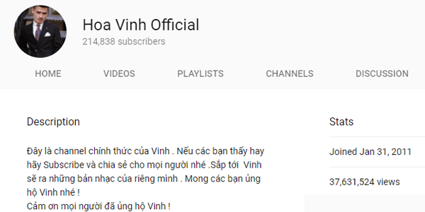Kênh YouTube được cho là của Hoa Vinh được lập từ năm 2011 và có trên dưới 7 triệu lượt xem tính đến thời điểm thực hiện bài viết.