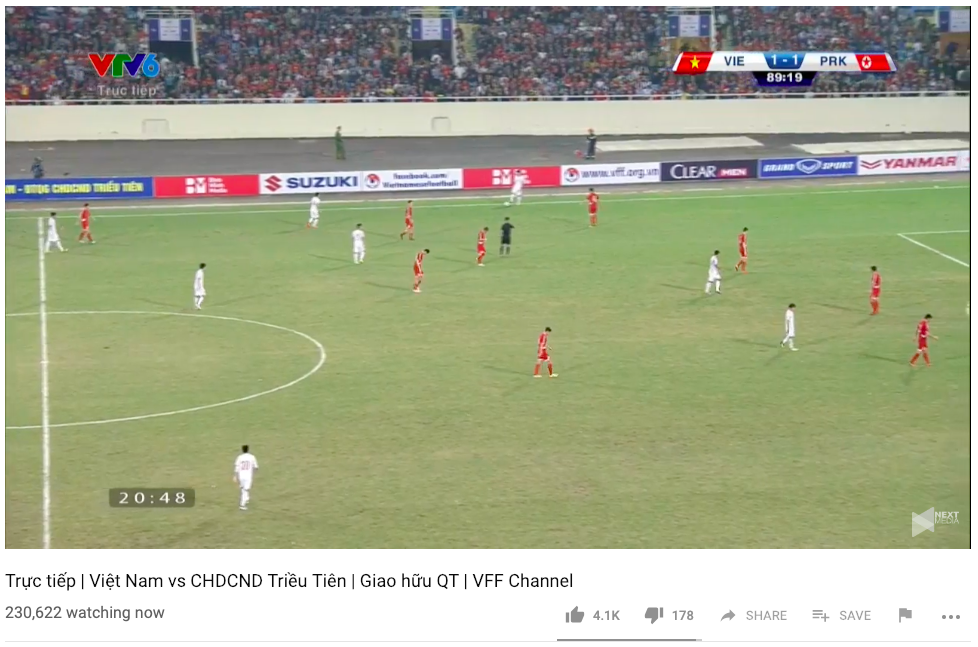 Theo ghi nhận, ở thời điểm cao điểm, có tới trên 230 nghìn người theo dõi trận đấu giữa đội tuyển Việt Nam và đội tuyển CHDCND Triều Tiên thông quan YouTube ở cùng một thời điểm. Điều này cũng đồng nghĩa với việc nếu tính con số người xem độc lập ở toàn bộ các thời điểm, con số người xem có thể cao hơn rất nhiều. Với tính chất của một trận đấu giao hữu và đội tuyển Việt Nam cũng không ra sân với đội hình mạnh nhất, con số nói trên là cực kì ấn tượng.