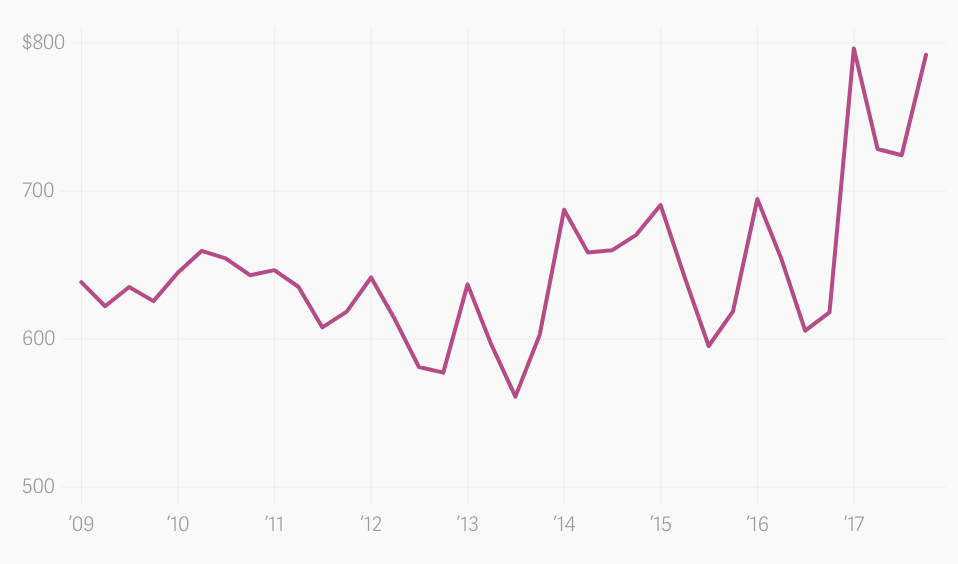 Thời gian gần đây, giá iPhone cũng tăng lên ấn tượng với mức giá bán trung bình một chiếc điện thoại công ty này bán ra dao động ở mốc 800 USD, tăng từ 650 USD trung bình khoảng hai năm trước đó. Ngay cả khi đã điều chỉnh tỷ lệ lạm phát, không có bất kì một chiếc iPhone nào “rẻ” như chiếc iPhone đời đầu bán ra năm 2007.