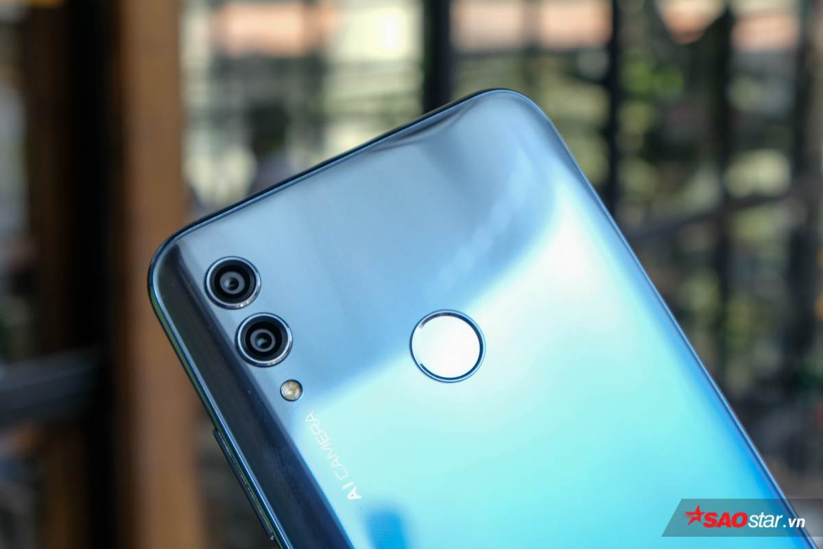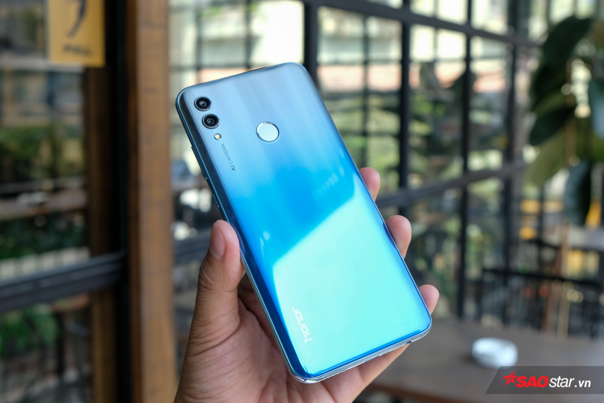 Honor 10 Lite sở hữu thiết kế nguyên khối sang trọng và hợp thời với mặt lưng giả kính được làm hiệu ứng gradient đa sắc. Đây cũng là vị trí cụm camera kép được đặt riêng biệt nhau, phía dưới là đèn flash LED và cảm biến vân tay hình tròn nằm gần giữa thân máy.