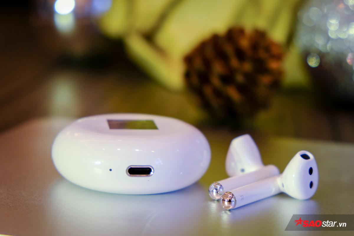 Tai nghe được đặt trong hộp sạc tròn, thiết kế để đặt vừa vặn trong túi và dễ dàng đặt gọn trong lòng bàn tay.