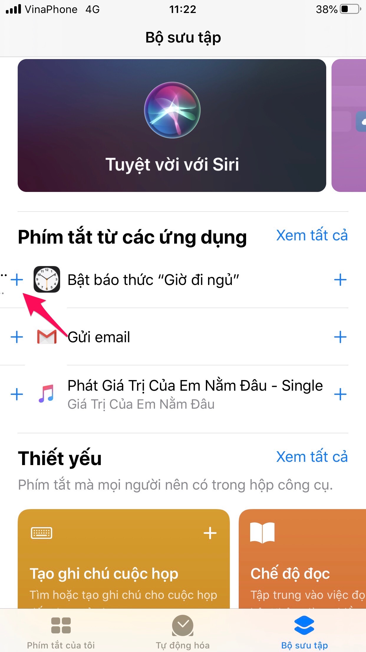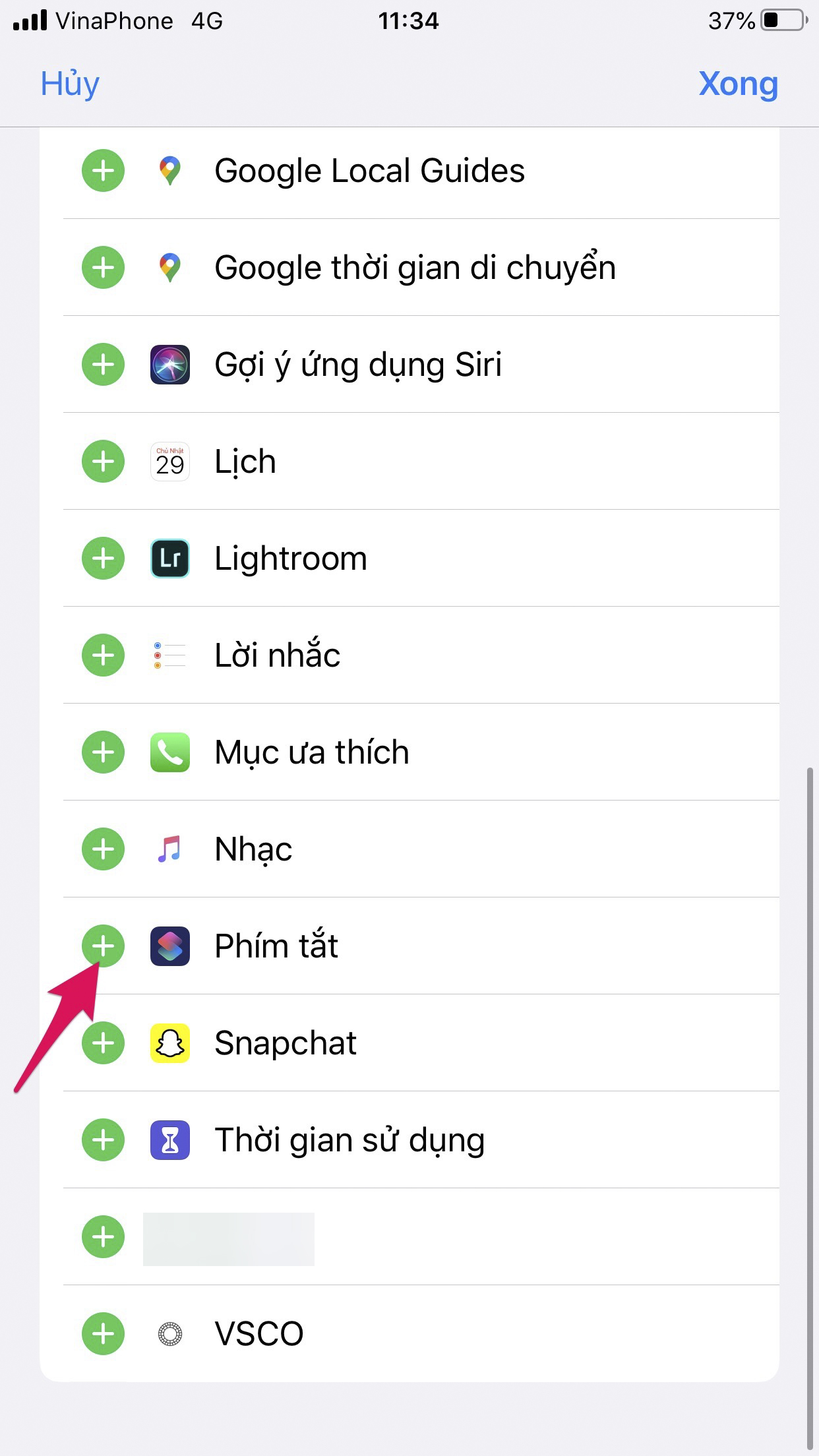 Ở mục Thêm Tiện Ích, bạn tìm và nhấn dấu cộng màu xanh để thêm Phím Tắt.