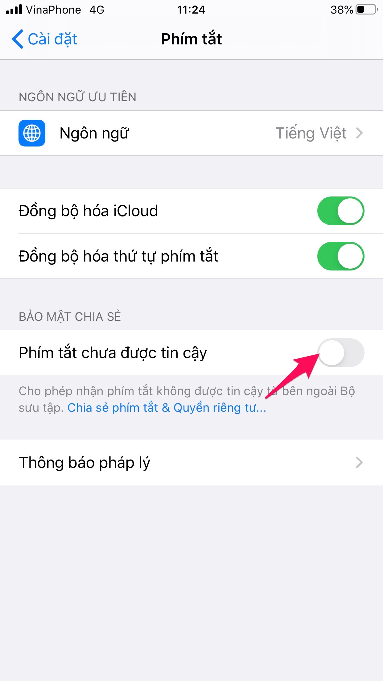Tiếp đến chọn kích hoạt “Phím tắt không tin cậy”.