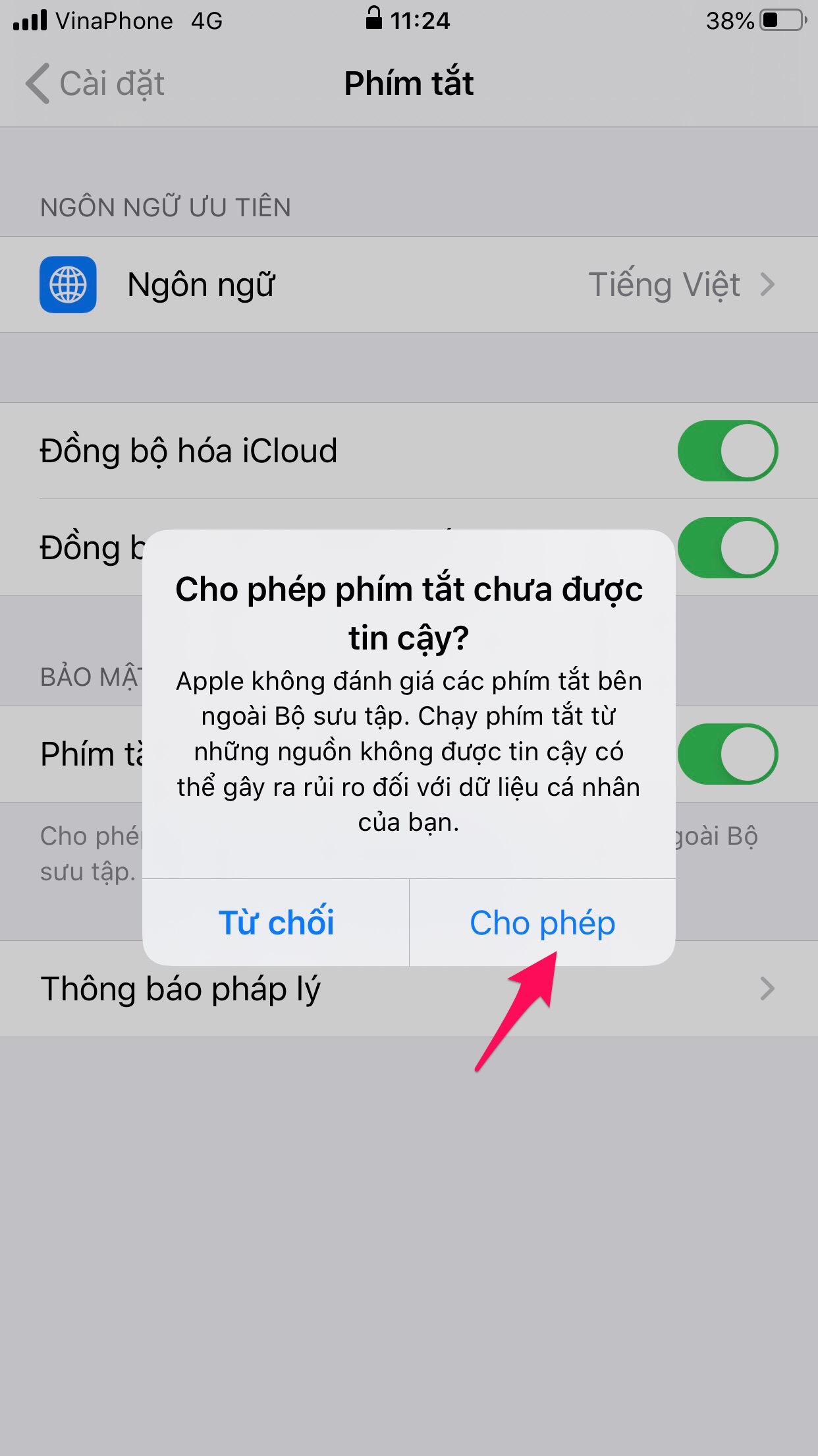 Nhấn “Cho phép” để có thể cài phím tắt từ bên ngoài vào máy.