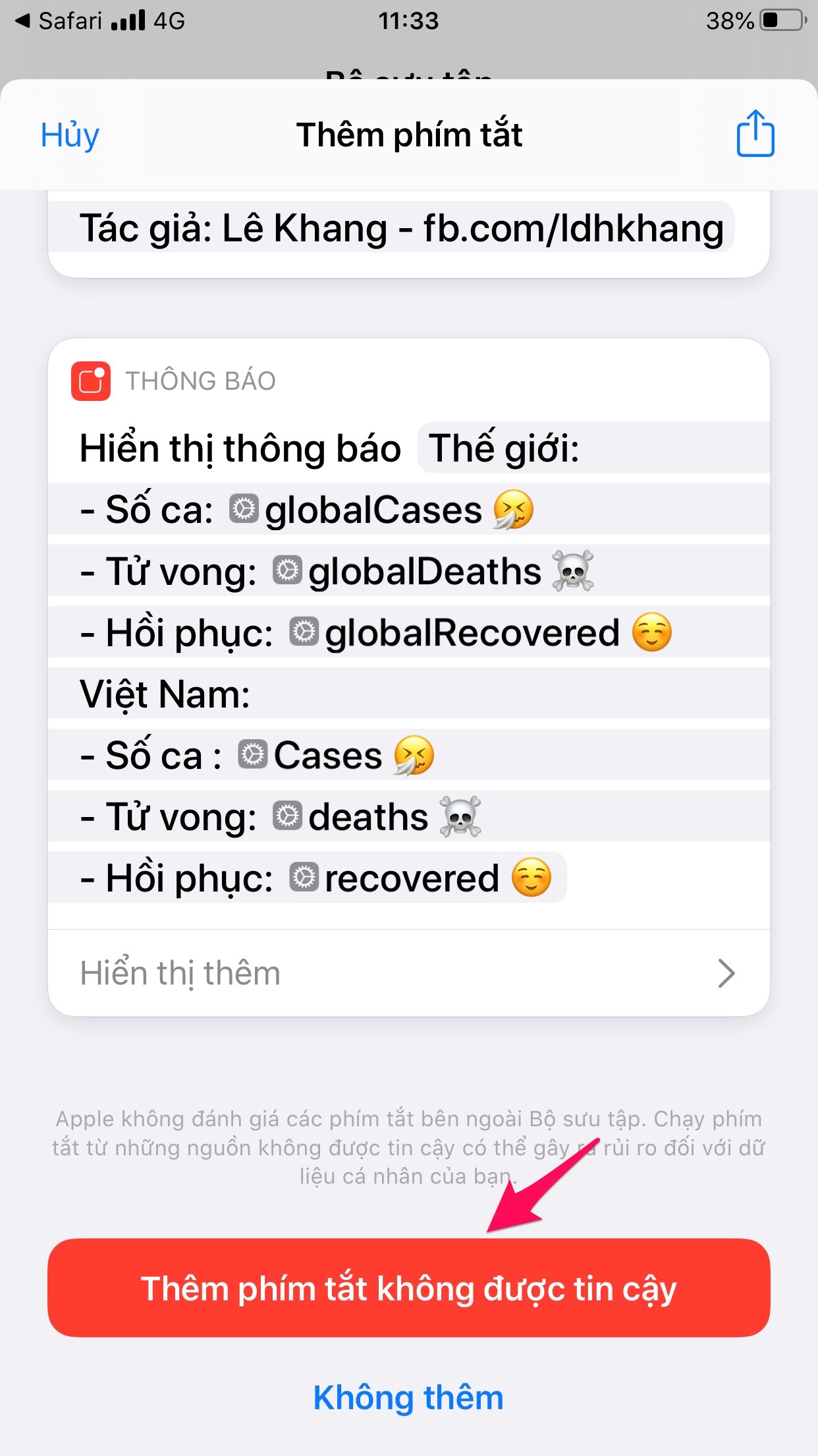 Sau khi nhấn “Get Shortcut”, hãy chọn “Thêm phím tắt không được tin cậy” để tiến hành cài đặt và có thể sử dụng phím tắt.