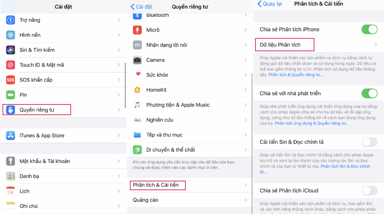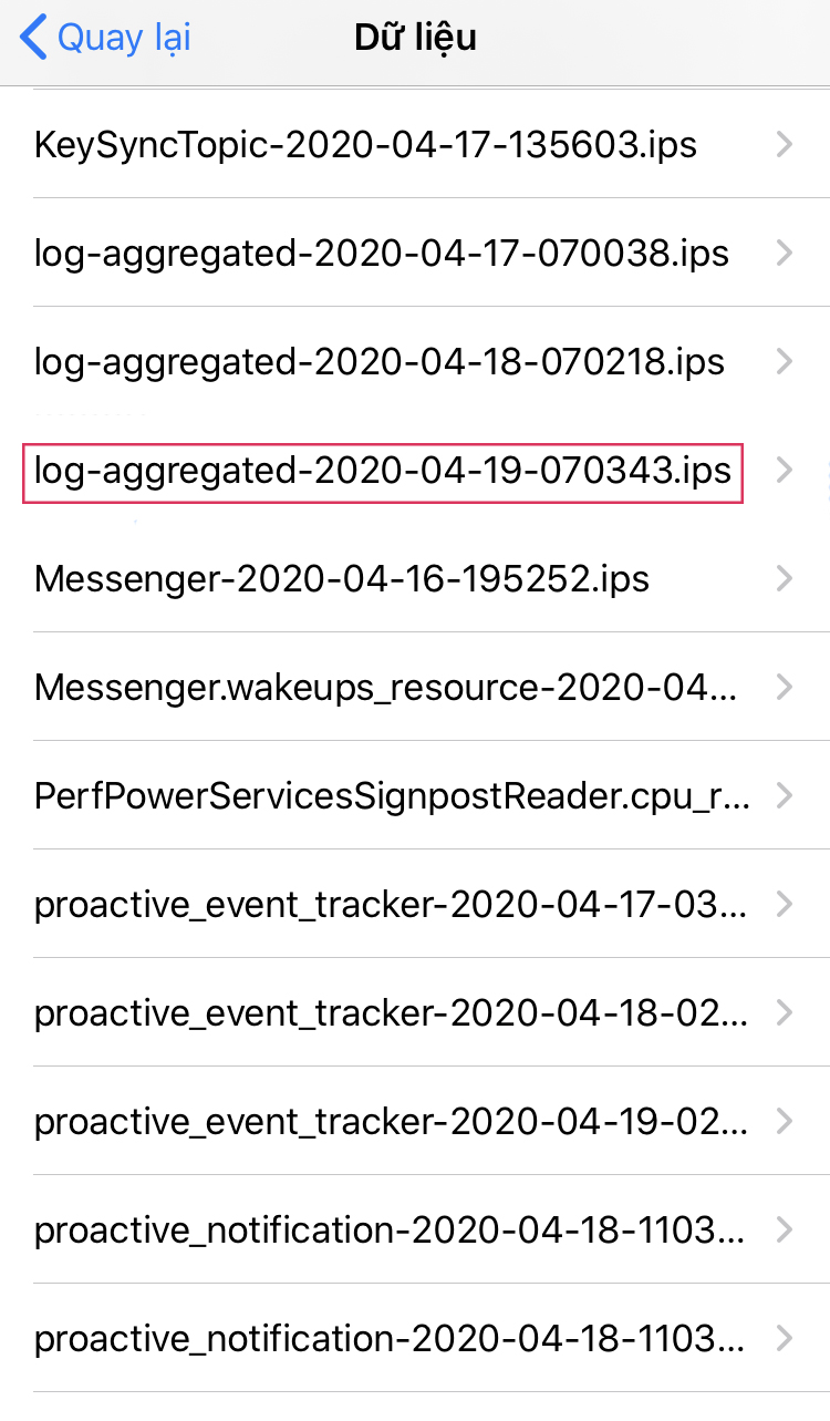 Bước 1: Đầu tiên, hãy vào Cài đặt > Quyền riêng tư > Phân tích & Cải tiến > Dữ liệu Phân tích. Tại đây bạn có thể tìm thấy hàng loạt bản ghi dữ liệu trên điện thoại của mình. (Nếu trước đó iPhone của bạn không bật “Chia sẻ Phân tích iPhone”, bạn phải đợi ít nhất 2 ngày để Apple có thể gửi dữ liệu về máy sau khi bật tuỳ chọn này)