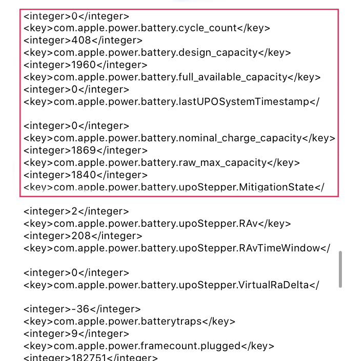 - Trong đó, apple.power.battery.cycle_count thể hiện số chu kỳ sạc (đầy 100%) của viên pin là 408 lần.